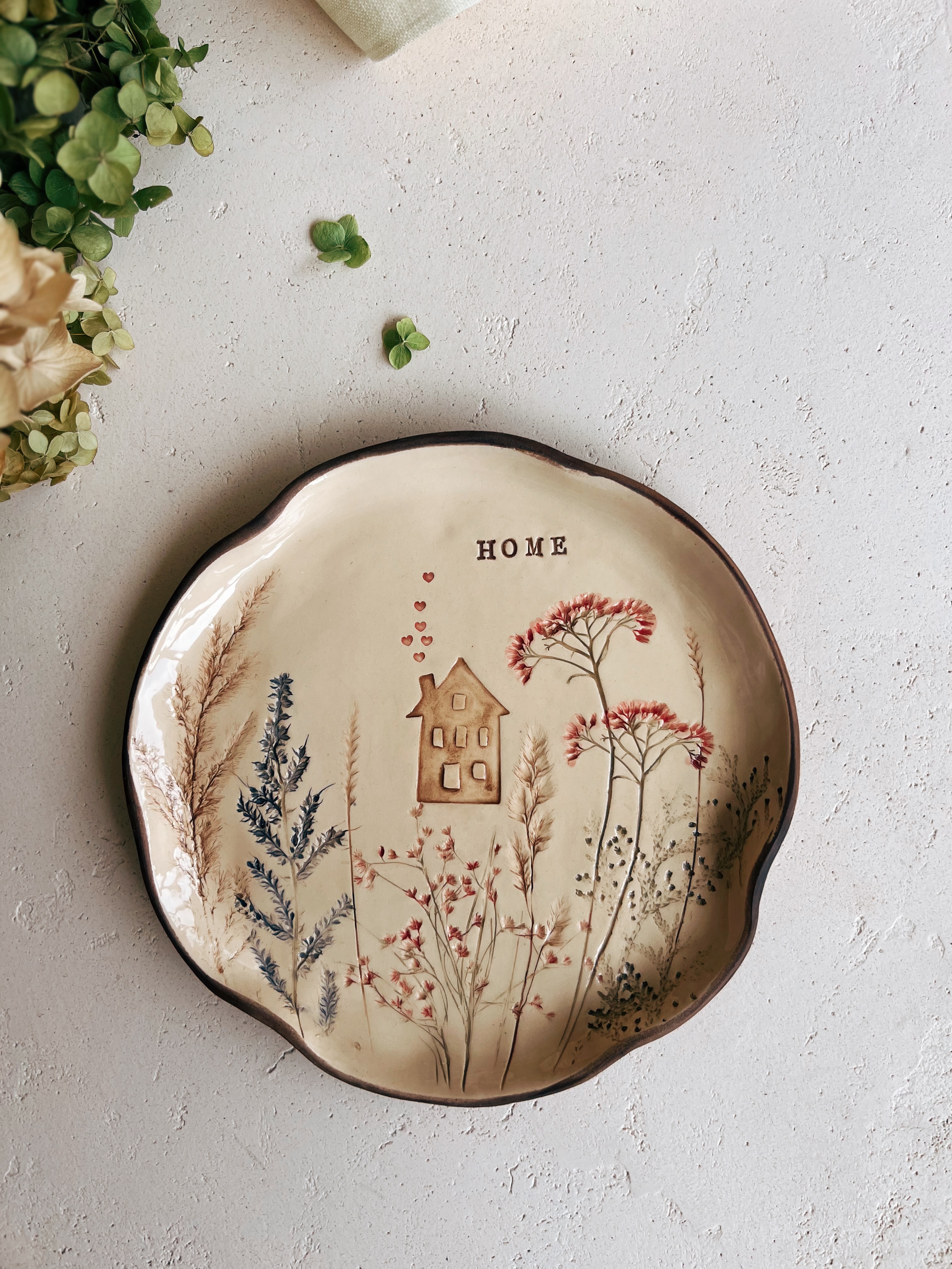 Тарілочки з різнокольоровим візерунком на бежевому фоні. Дизайн який відгукується десь всередині любов'ю до Землі-Матінки. Тарілочки природнього натурального кольору глини прикрашені відбитками натуральних трав, які розмальовані різними кольорами - це про поле, про дім, про лляну скатертину, про домашні страви та родину, яка дбає один про одного, про природу та середовище, про сімейні традиції.